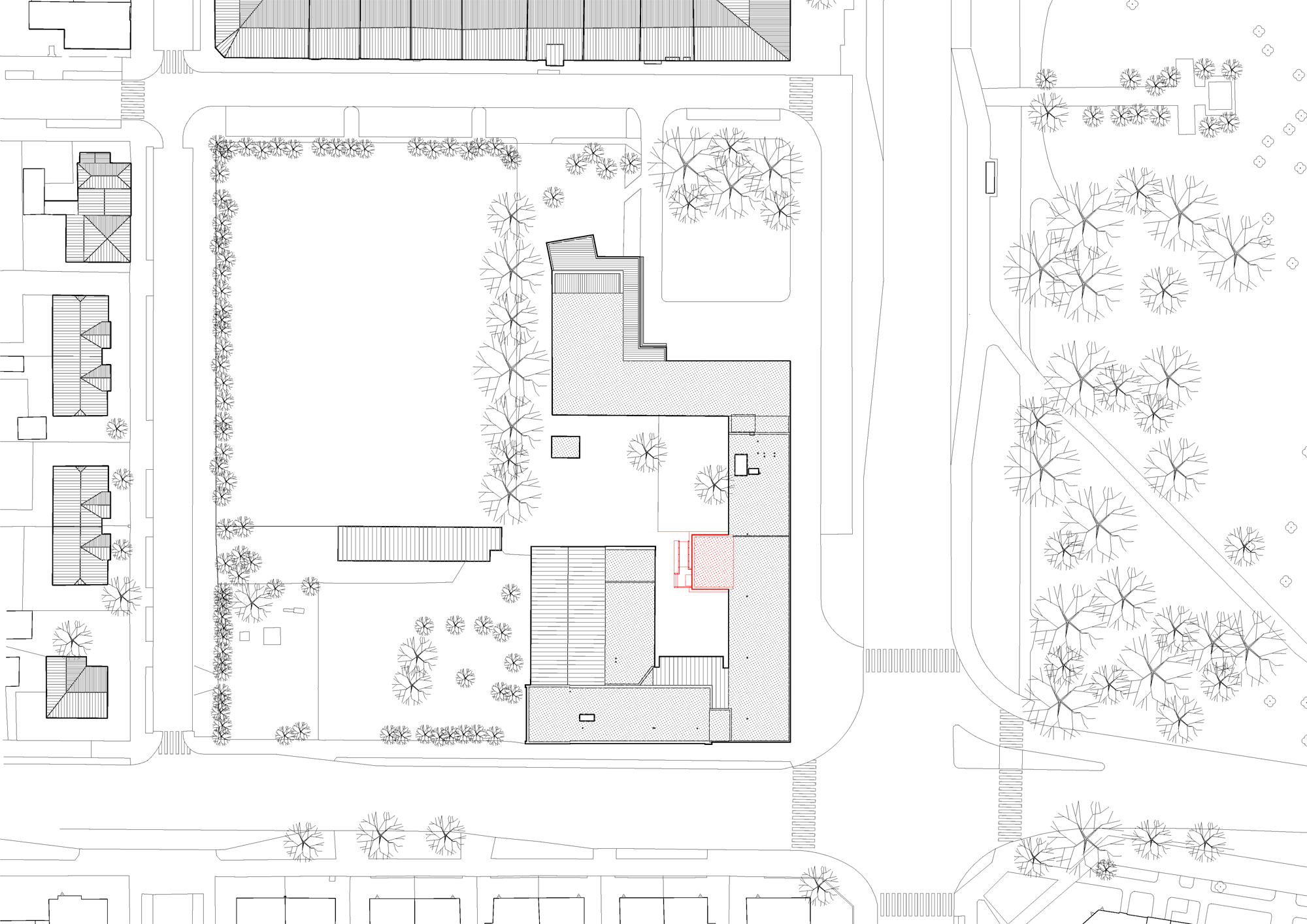 K interiéru schodišťové věže jsme rozhodli přistoupit jako k materiálové koláži, která přiznává konstrukční řešení — zdiva a betonových konstrukcí v jejich běžné stavební “ne-interierové” hrubosti. S interiérovou přesností koláž doplňují sádrokartonové obklady ostění oken a dveří i zámečnické prvky. Potkávají se tu červené keramické cihly, přiznané betonové prvky schodišťových ramen, stropů, věnců a nadpraží oken, sádrokartony natírané světle modře, šedé podlahy opatřené epoxidovým nátěrem — vše doplněné probíhající bílou linkou v místech, která se budou nejvíce špinit a kde je možné nátěr pravidelně obnovovat. Tmavé jsou pak vložené zábradelní trubky, okna a dveře. Snažili jsme se vytvořit nesterilní, hravě komponovaný prostor, který bude působit přátelsky, aniž by byl ozdoben dětskou tvorbou. Pro tu je místo v jiných částech školy — věž musí být striktně prostá jakýchkoliv hořlavých prvků aúprav stěžujících jak orientaci unikajících, tak zasahujících hasičů.